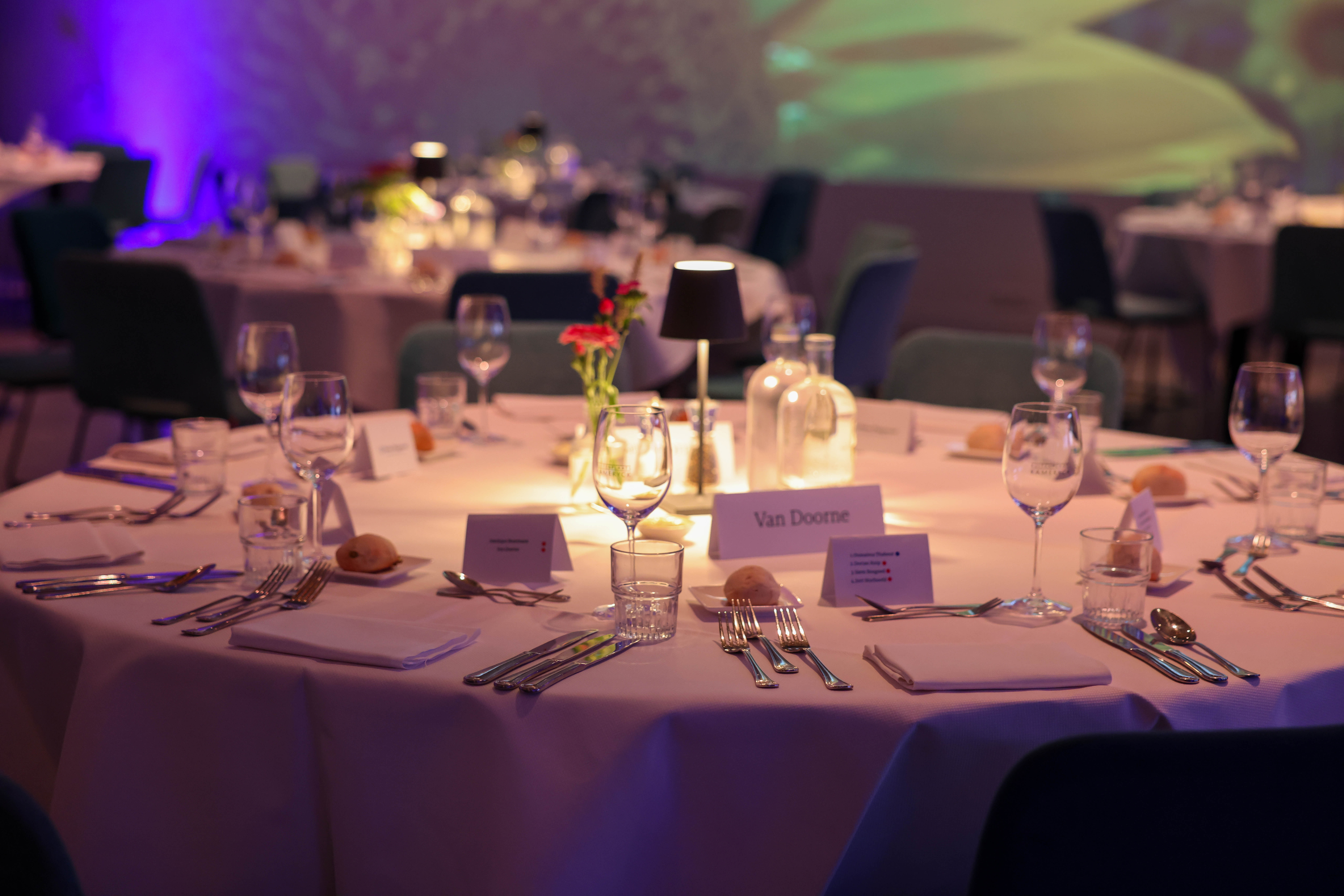4-gangen diner aan ronde tafels, met tafelschikking die per gang wisselde
