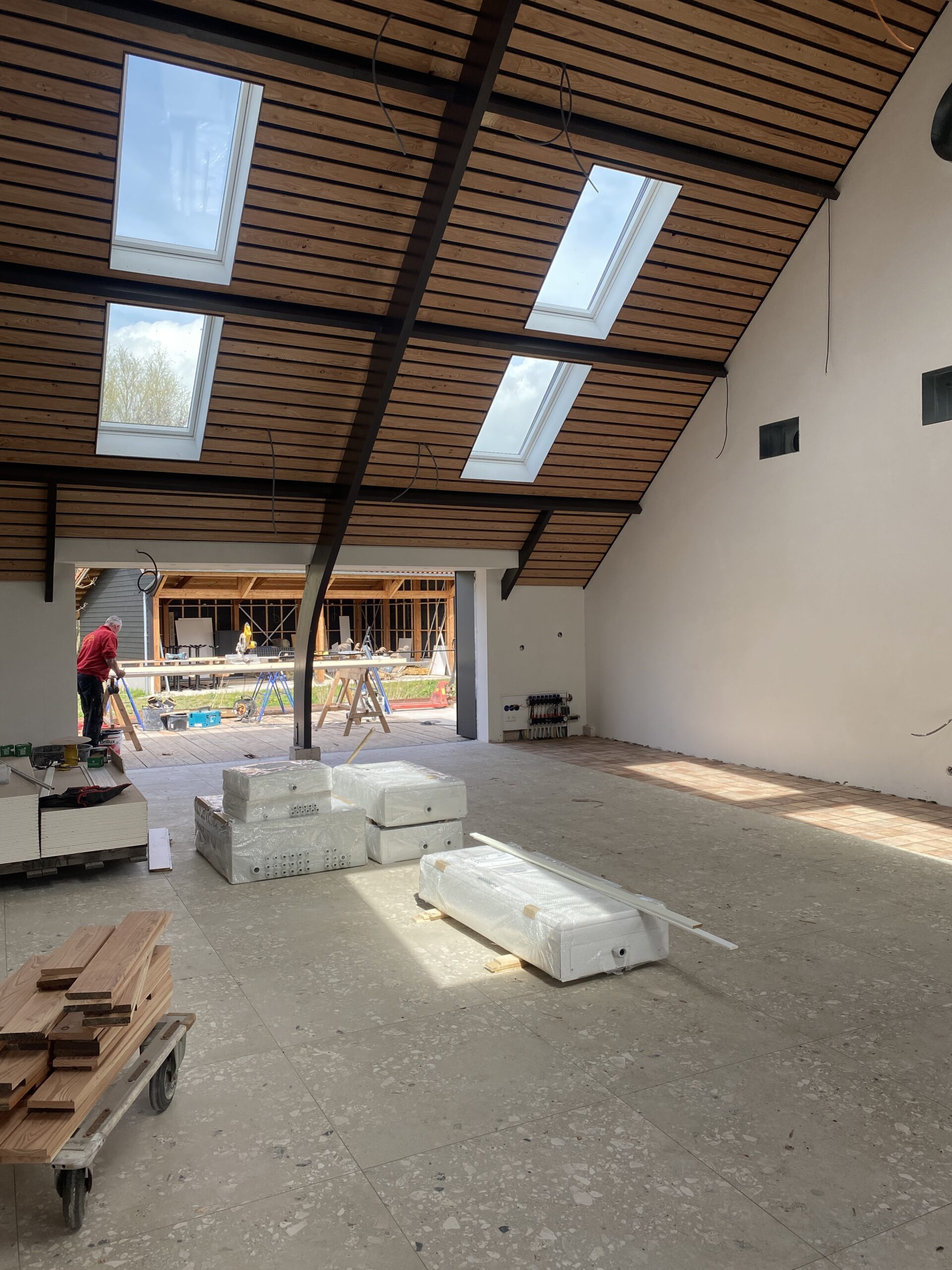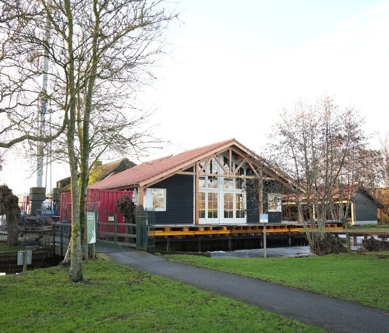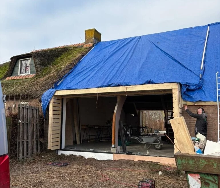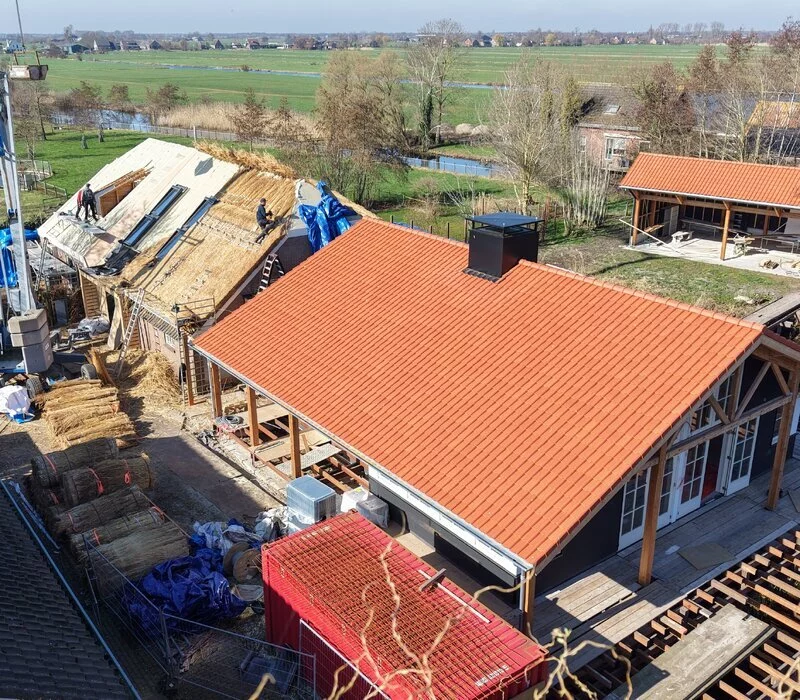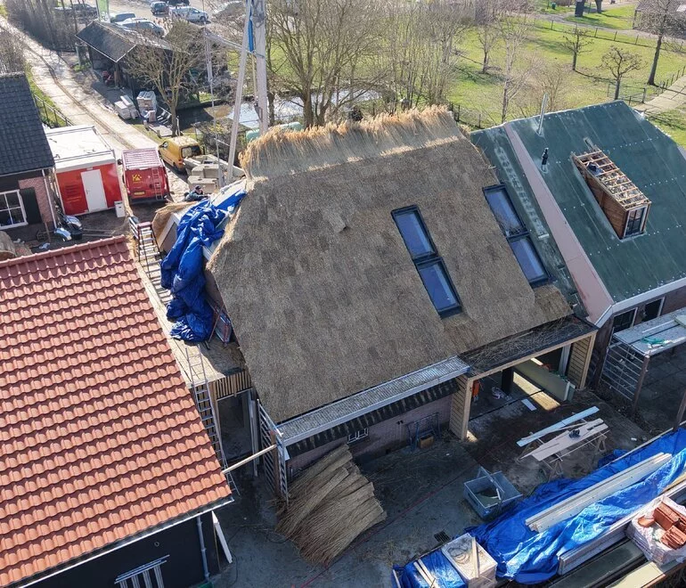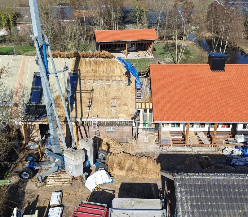 Het ontwikkelt zicht razendsnel, op 28 oktober werden er zelfs al kozijnen geplaatst. Op 5 december is het hoogste punt bereikt. Medio januari is de nieuwe gevelbekleding erop gezet. De grote dakramen zijn geinstalleerd in het bestaande deel die zorgen voor mooi lichtinval. Ook ligt er inmiddels een mooie tegelvloer in het restaurant gedeelte. En het eerste stucwerk binnen is zichtbaar. Aan de buitenkant zijn de vorderingen ook goed zichtbaar. De dakpannen liggen op het nieuwbouw gedeelte en aan het vernieuwde rietendak wordt ook hard gewerkt.
